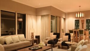 Think shades of beige, white, and brown—until your eyes meet a bold green sofa, Gauri’s signature surprise that pops without overpowering. A lion painting dominates the wall, adding a layer of strength and regality. The space is dotted with lush house plants, custom lighting, and decor that whispers luxury instead of shouting it.
