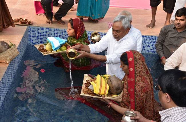 Patna: At his official residence in Patna, Bihar Chief Minister Nitish Kumar and his family offered prayers to the rising sun on Tuesday as part of the Chhath Puja traditions.