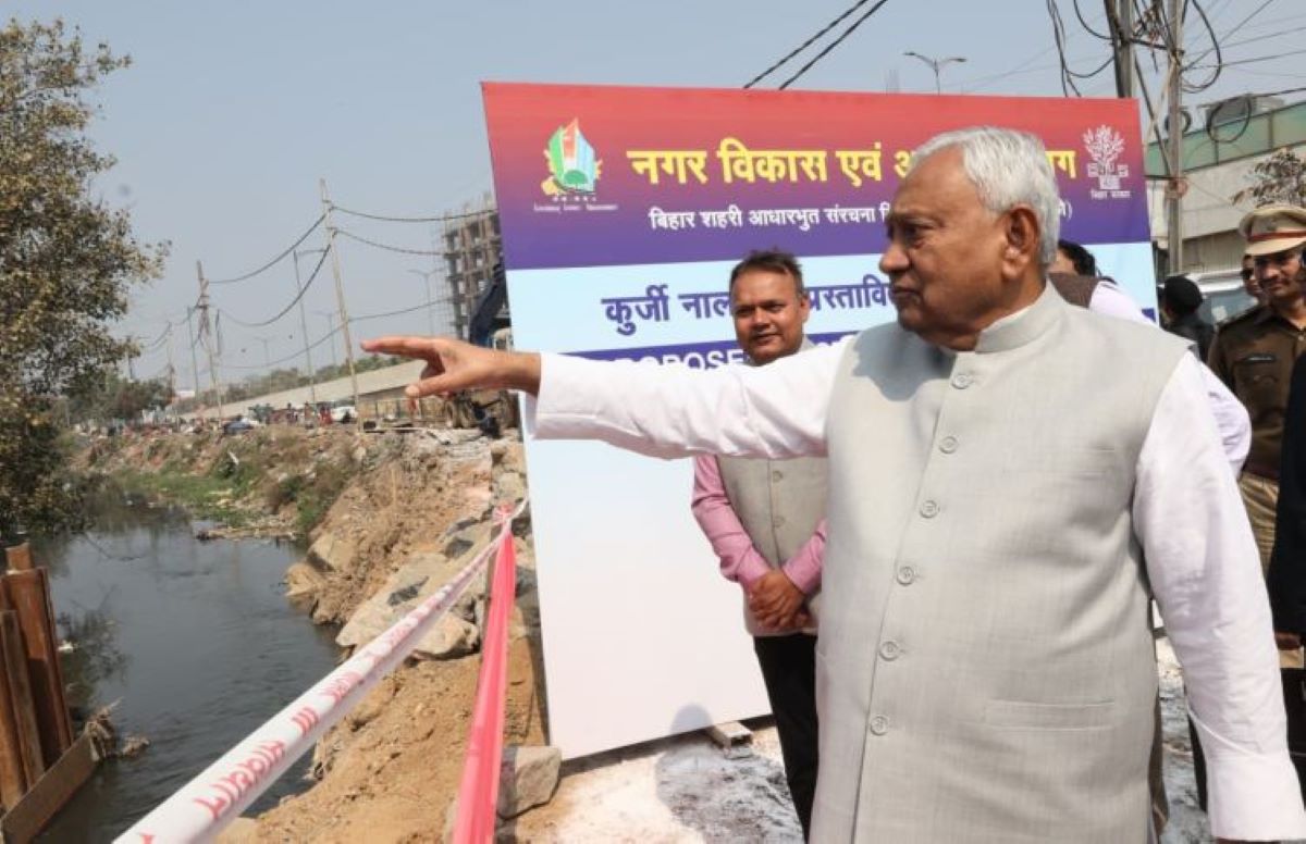 Patna: Bihar Chief Minister Nitish Kumar on Sunday inspected the ongoing construction of the Kurji (Rajiv Nagar) and Anandpuri drain projects, reaffirming the government’s focus on tackling persistent waterlogging and traffic congestion in the city. During his visit to the Ashiyana–Digha Road area, he directed officials to accelerate the pace of work and ensure timely completion, especially to provide relief from recurring monsoon flooding.