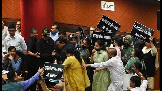 Using the shouts “abki baar, AQI 400 paar,” AAP members demonstrated in the House chamber at 12:05 p.m.