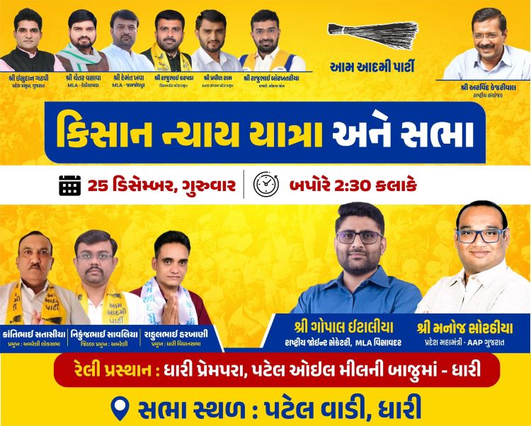 AAP organizes Farmers’ Justice March in Dhari, Amreli on December 25. MLA Gopal Italia and Manoj Sorathiya to address farmers’ grievances.