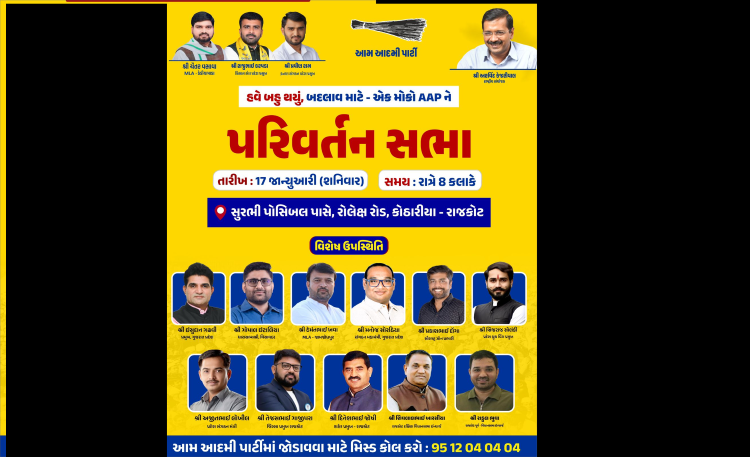 Rajkot, Gujarat – January 17, 2026: The Aam Aadmi Party (AAP) Gujarat is set to organize a “Parivartan Sabha” in Rajkot as part of its ongoing efforts to engage with the public and strengthen the movement for systemic change. The event will witness the presence of key leaders from the AAP Gujarat regional team, who will address the gathering and outline the party’s vision for governance reform.