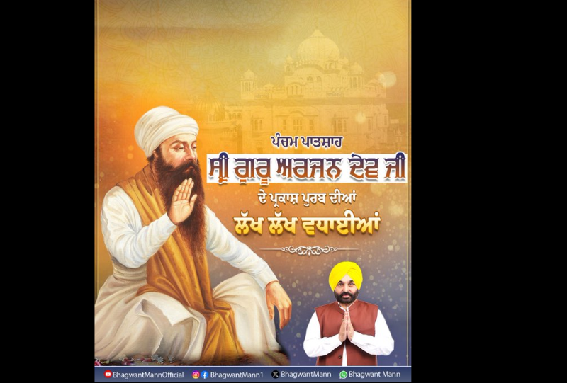 In a message shared on social media, CM Mann said, “Heartfelt congratulations to the entire Sangat on the Prakash Purab of Guru Arjan Dev Ji. May our prayers before Akal Purakh invoke the Guru Sahib Ji’s grace upon all families and keep everyone in ascending Chardi Kala.”
