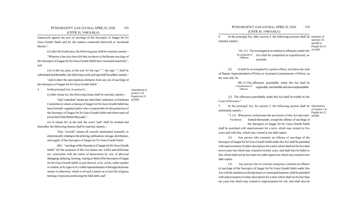 With its notification, the Sri Jaagat Jot Guru Granth Sahib Satkar Amendment Act 2026 is now officially in force across Punjab.