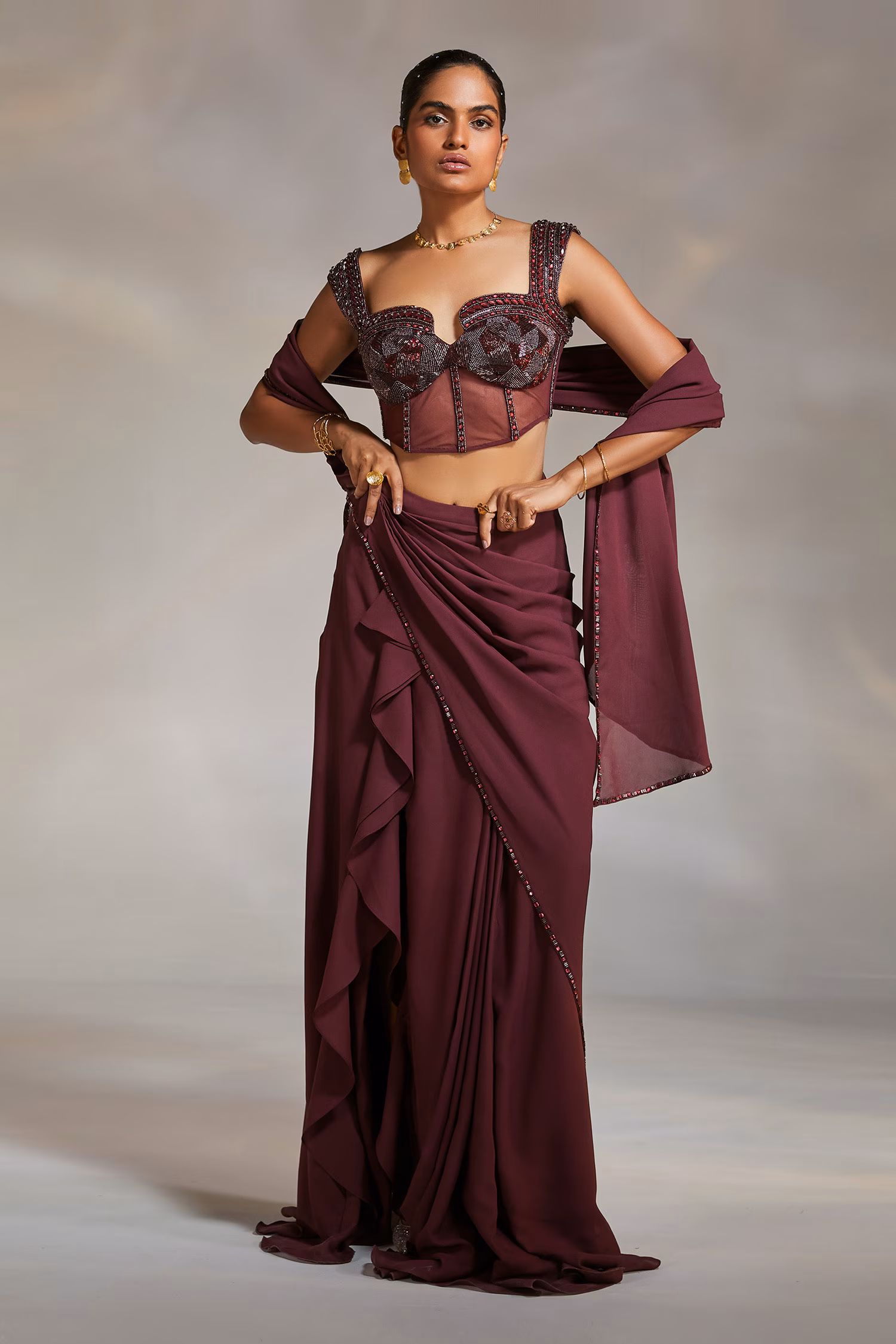 Bold Yet Graceful – Black Saree Paired with a Heart-Neck corset Blouse